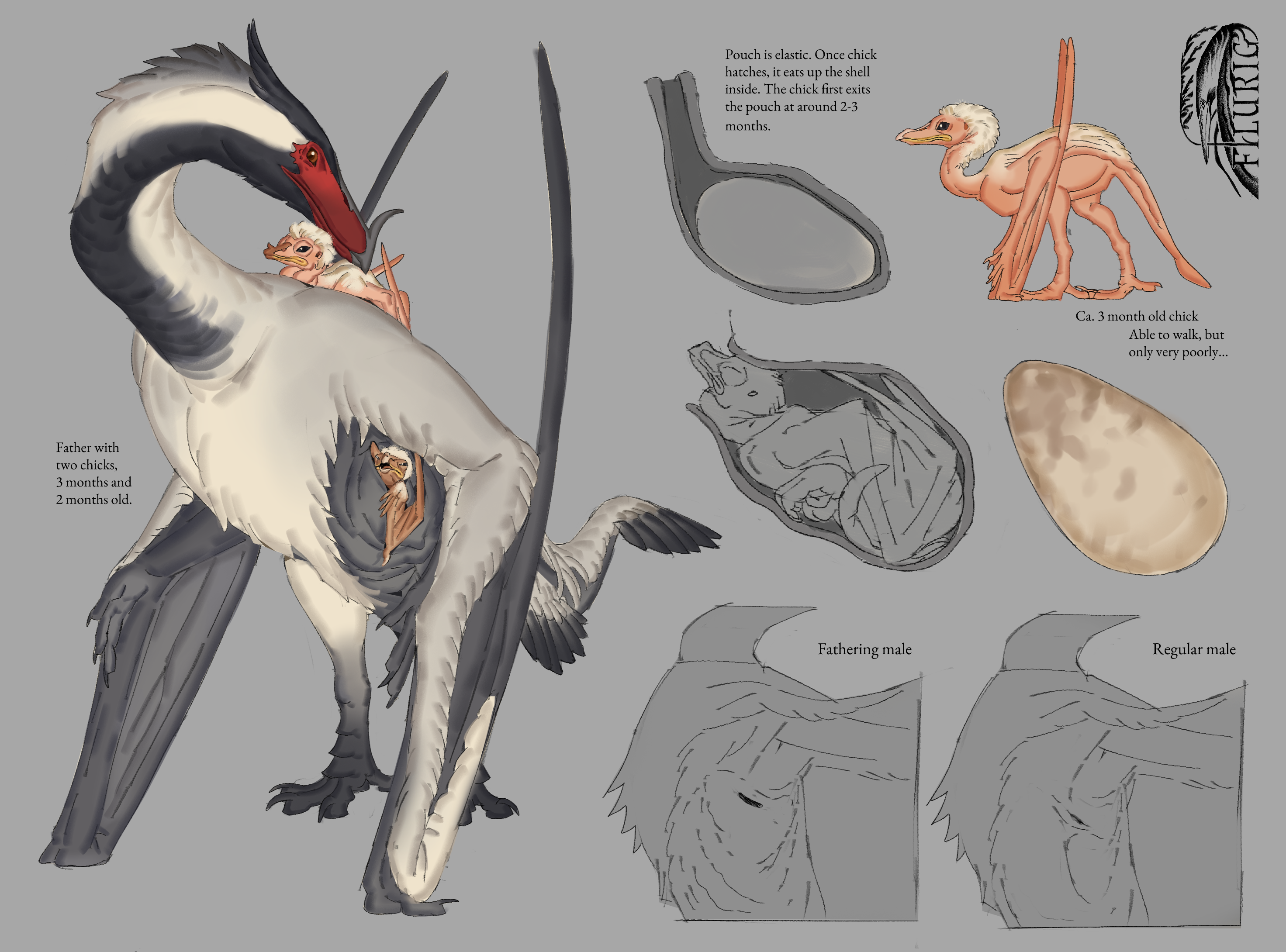 as mentioned prior, basilisks don't (often) have very obvious sexual dimorphism, and what sexual dimorphism that does occur by chance actually plays very little into how sexual selection played into their evolution. it is also just less relevant as sexual selection nowadays is very culturally influenced. basilisks undergo an annual fertility period during spring, after which the female will lay 1-2 eggs during summer, unfertile or fertile. the male's pouches mentioned earlier, a trait basal to dactylopodinae, are then usually utilised for an intriguing form of pseudo-ovovivipary. the eggs are placed inside of the pouches where the chicks develop over the following year until hatching during the next spring. of course though there are surely cultures where this practice might have changed or are carried out in different ways. the chicks are altricial, and instinctively are inclined to cling to its father, staying in the pouch until growing too large to where it will climb onto his back hump.