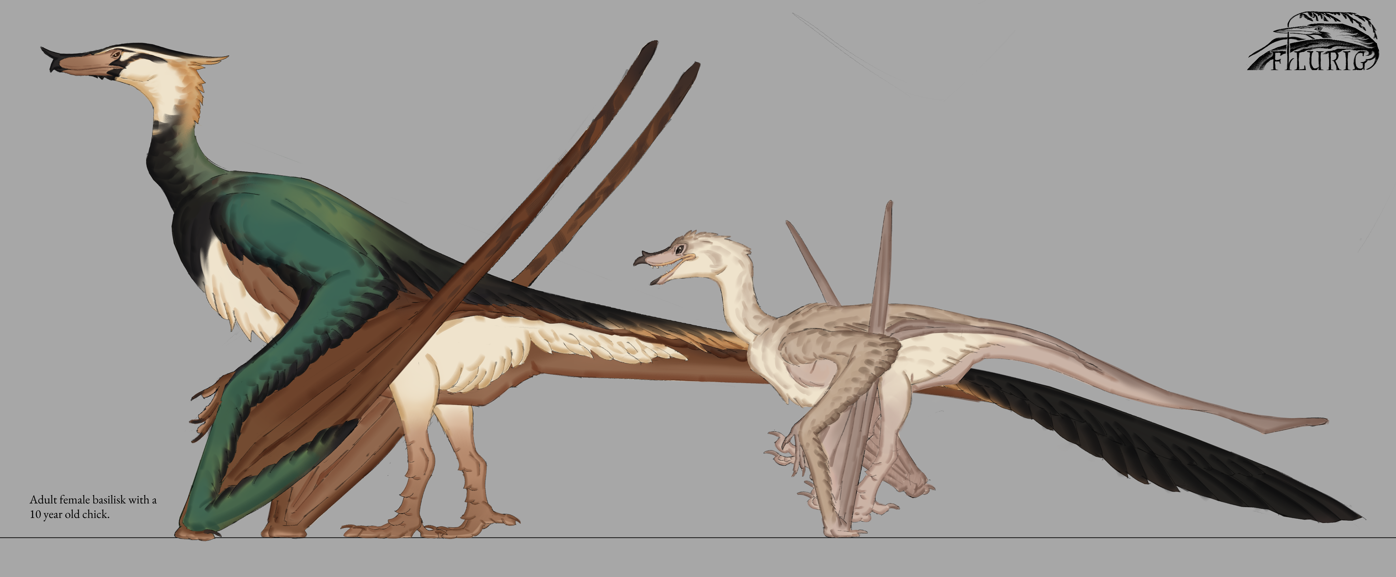 basilisks are omnivorous non-avian saurischian dinosaurs, averaging at around 1.5-1.6 m at the shoulder, with a highly variable appearance. a dactylopodian, they are unusual quadrupeds with winged forelimbs, the name hinting at the nature of said limbs; that being, that the "foot" is composed of two highly derived fingers, one supporting the limb ("foot") while the other serves as a webbed wing. as mentioned, their variable appearance makes them difficult to describe with absolute consistancy, but their general body and facial structure can be. basilisks integuement is varied, consisting of feathers of different structure ranging from plume-like to hair-like and thin (the latter found covering the leathery, "bare" areas, except for the bare face). their faces and hindlegs are scaled, the former in a very delicate manner. there is little basal sexual dimorphism in basilisks, with the exception of size (females being larger on average) and a feather "fan" present near the base of the tail only in males, however, exceptions exist for basilisks which resemble sexually dimorphic species (see shapeshifting section). males also possess two pouches on their sides which are usually hard to see, but expand internally after having mated.