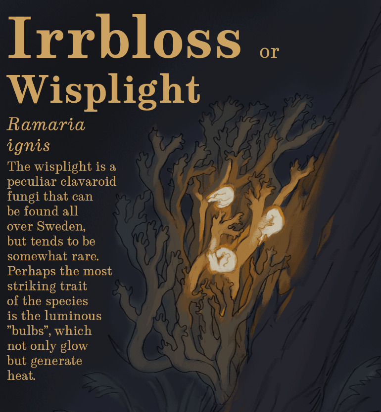 a keystone species in pareidolia is the irrbloss, or shroom/wisplight, which is a fungus and one of those nonsapients that have managed to evolve a use for anda. it is believed that it first evolved such an ability to ward off potential predators, utilising progressively more and more complex light displays when sensing potential threats to scare them away. this is effective on some, however, this also made the fungus a more attractive food item, as more concentration of anda = more calorie dense = if an animal is not deterred by the light displays, it increases their fitness. it happened to be that intelligence was one of the factors that contributed to several species evolving to ignore the light displays, which kind of goes hand in hand with the anda/perception/consciousness correlation. this kind of started an evolutionary armsrace where a byproduct of the anda concentration in the fungus was a similar perception altering effect to some animals (such as basilisks), where the fungus exudes an amount of anda that would twist how other organisms see the area around them, simply put, "hiding" areas where a large enough congregation of shroomlight grew by altering how they percieve it.